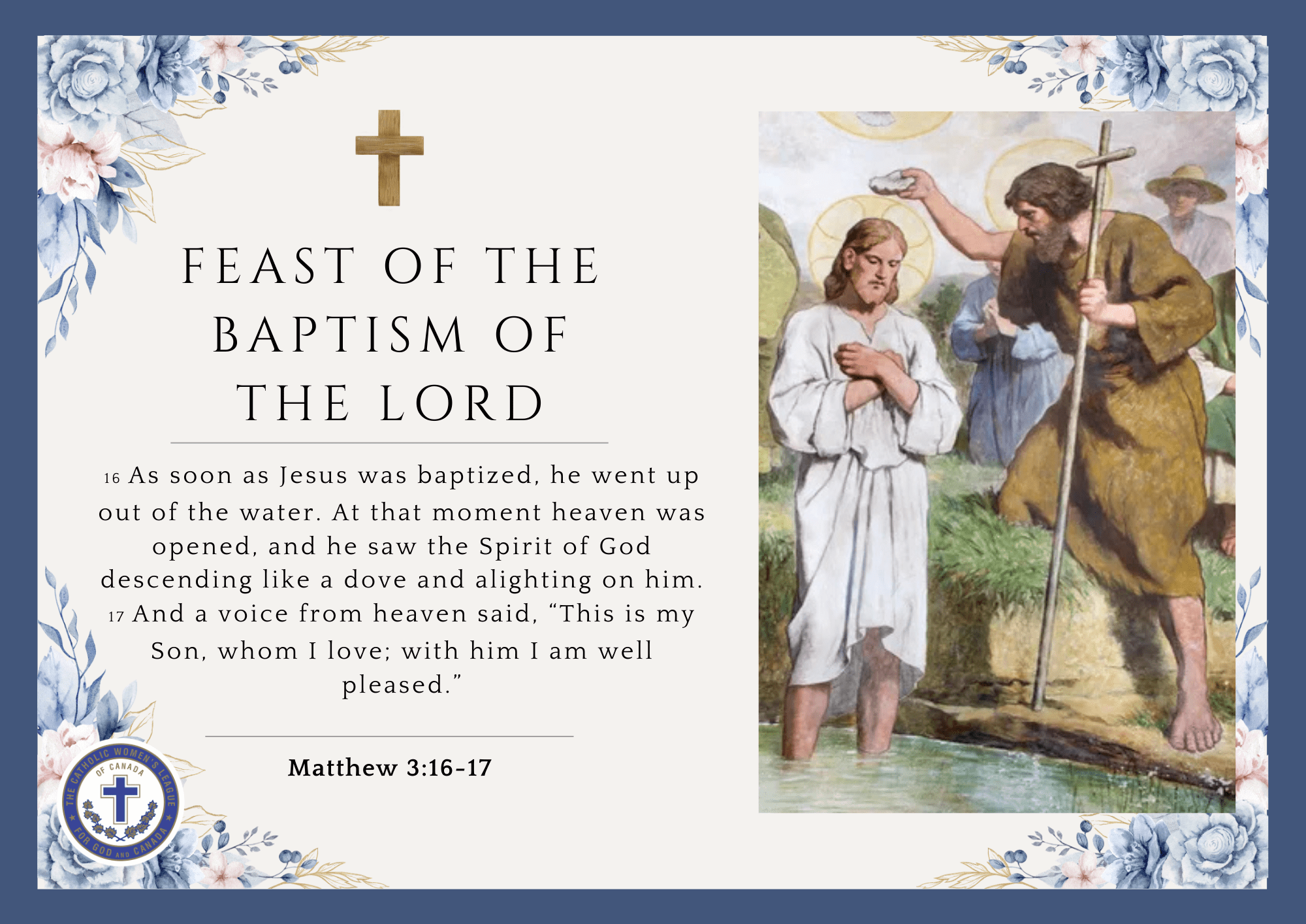 The Feast of the Baptism of the Lord commemorates the baptism of Jesus in the Jordan River by John the Baptist. Jesus’ baptism reminds us of our mission to experience the presence of God within us, to acknowledge our own dignity as God’s children, and to appreciate the Divine Presence in others by honoring them, loving them and serving them in all humility.
