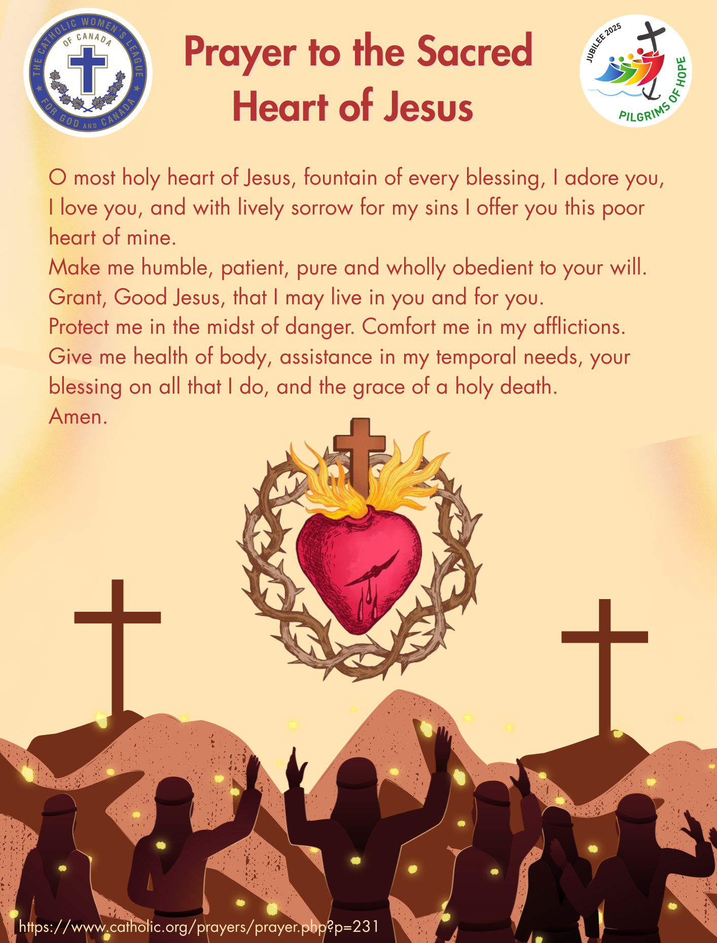 The month of June, dedicated to the Sacred Heart of Jesus, became a popular devotion in the late 1600s. The Heart, with droplets of blood, encircled by thorns, with flames and a cross at the top, and surrounded by divine light, is symbolic of the heart of Jesus and His sacrificial love for humanity. The World Day for the Sanctification of Priests coincides with that of the Sacred Heart of Jesus. Members are invited to pray for priests and for personal holiness and a loving heart in imitation of Jesus.