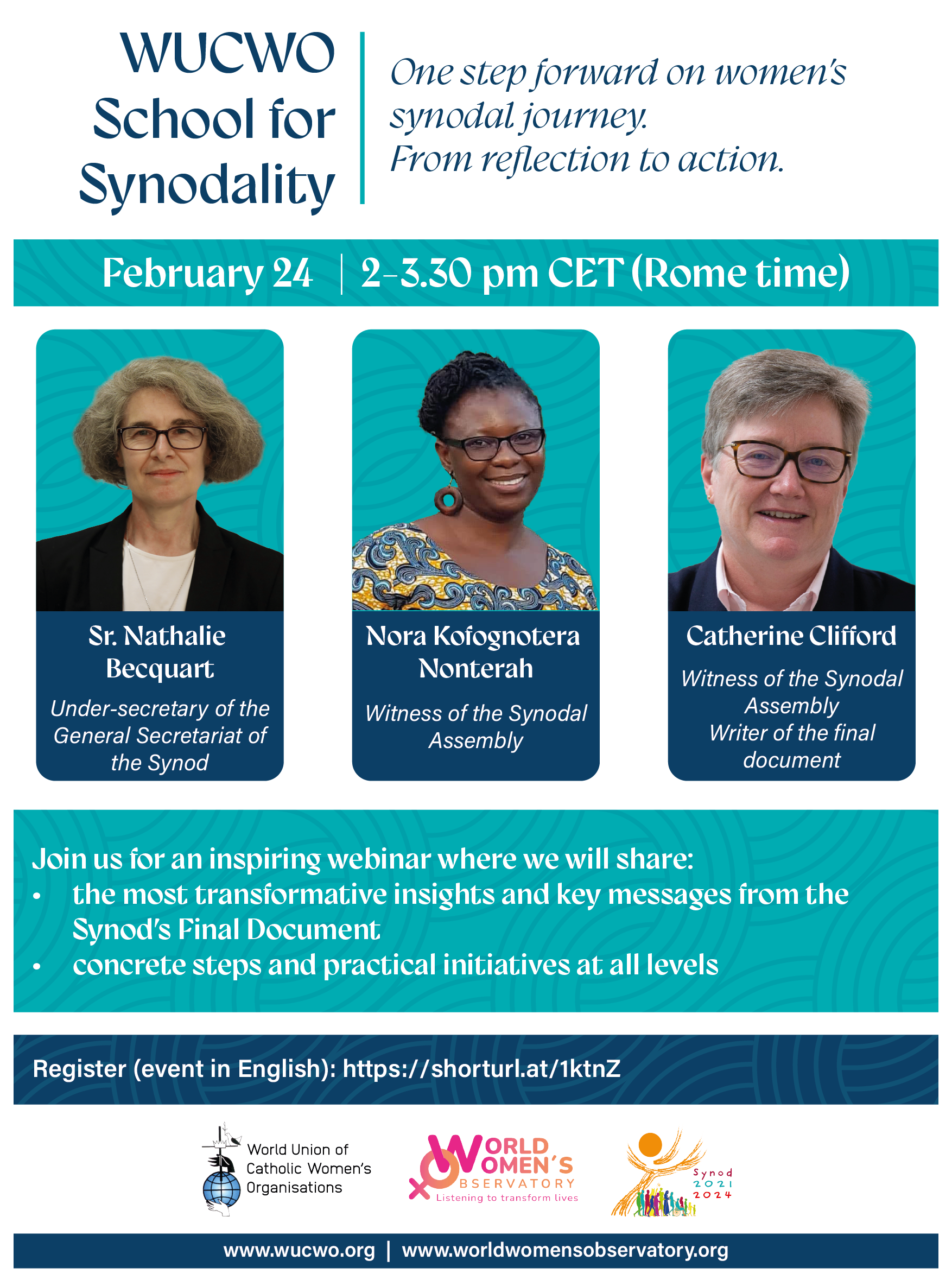 WUCWO’s School for Synodality, invites you to participate in our webinars: “ One step forward on women’s synodal journey. From Reflection to Action”. Our aim is: