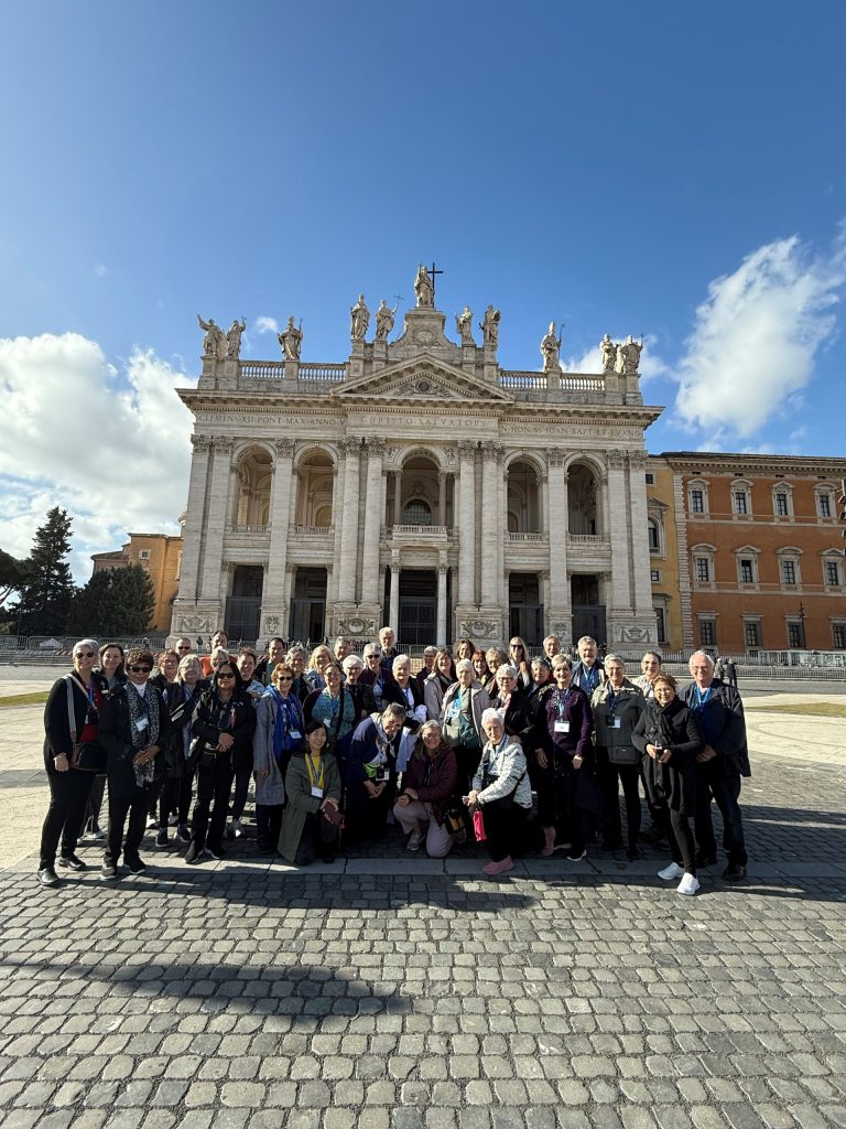 On day two of the League Pilgrimage to the Holy Doors, the group visited the Holy Stairs then walked over to the first holy door at St. John Lateran. Mass was celebrated by Bishop Campeau in the chapel. The group paused for a photo before visiting the church of St. Helen, followed by walking through the second holy door at Santa Maria Maggiore where the late Pope Frances is entombed.