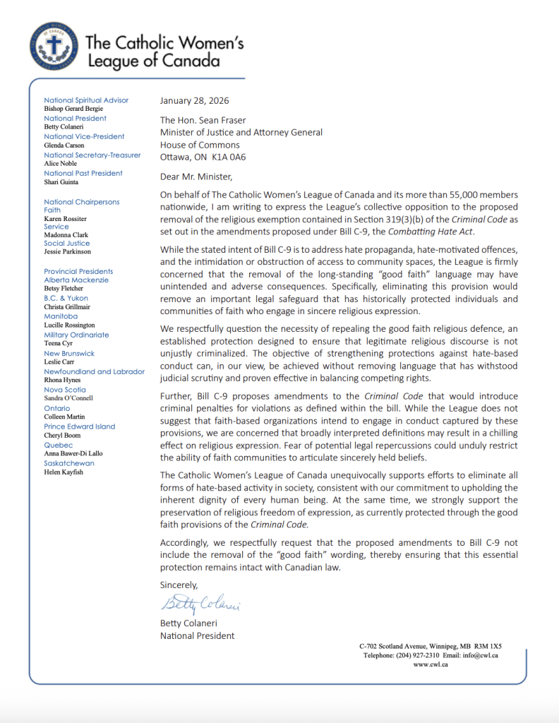 Letter from National President Betty Colaneri to Minister of Justice re. Bill C-9 amendments