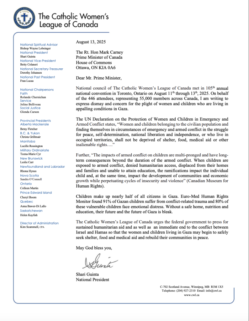 A letter dated August 13th, 2025 regarding concern for the plight of women and children who are living in