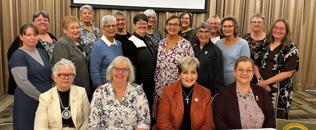 Middle Row, left to right: Military Ordinariate Provincial President Teena Cyr, Quebec Provincial President Anna Bawer-Di Lallo, New Brunswick Provincial President Leslie Carr, Nova Scotia Provincial President Sandra O’Connell, Prince Edward Island Provincial President Cheryl Boom, National Chairperson of Social Justice Jessie Parkinson, Alberta Mackenzie Provincial President Betsy Fletcher, Director of Administration Kim Scammell