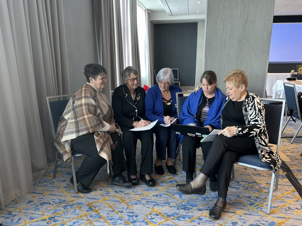 At the recent national executive/board meeting, time was allotted for planning workshops for the upcoming national convention in August. Pictured left to right: Nova Scotia Provincial President Sandra O’Connell, National Chairperson of Service Madonna Clark, Newfoundland and Labrador Provincial President Rhona Hynes, Military Ordinariate Provincial President Teena-Marie Cyr and Quebec Provincial President Anna Bawer-di Lallo.